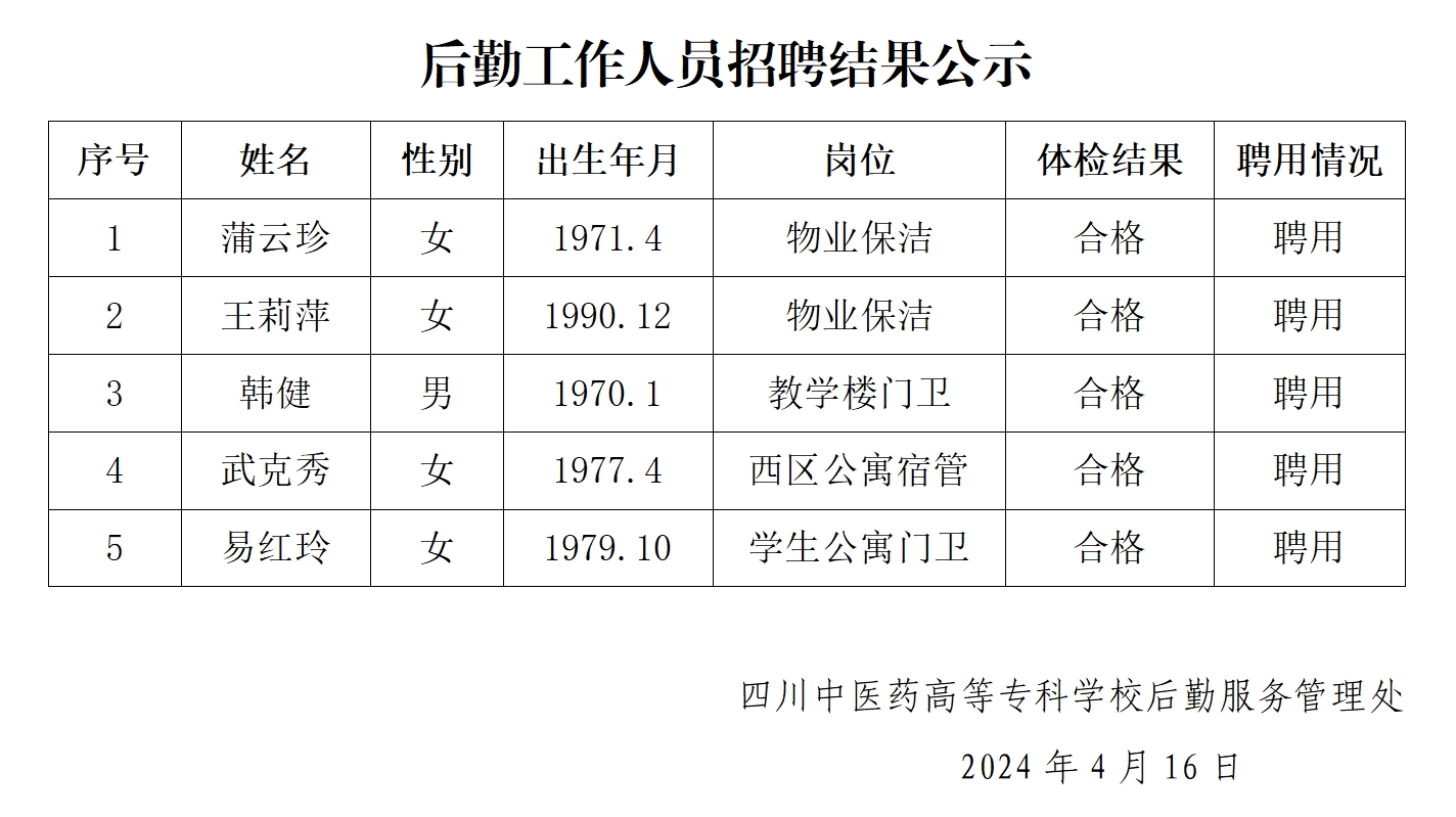 后勤工作人员招聘结果公示
