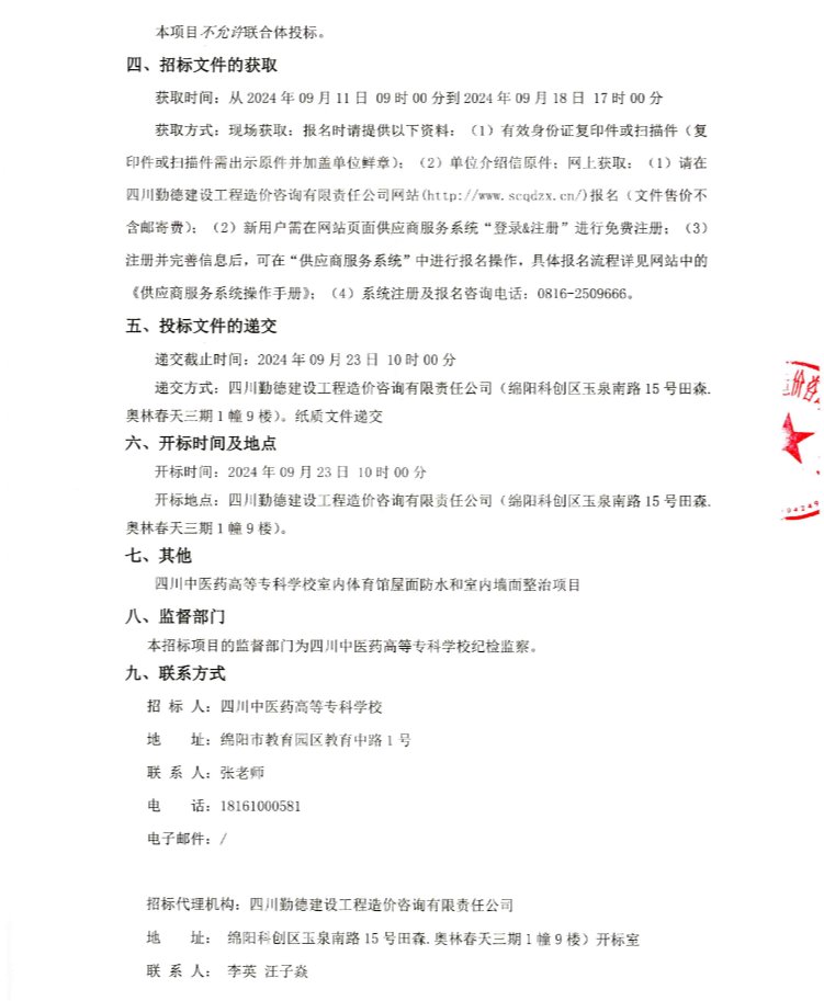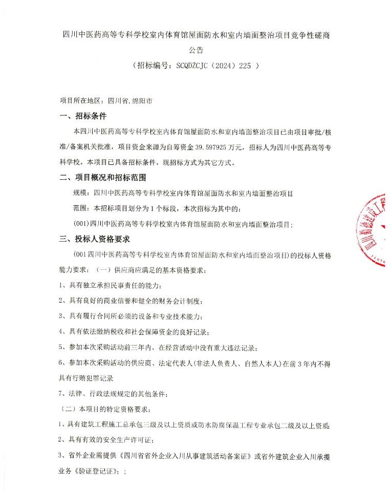 四川中医药高等专科学校室内体育馆屋面防水和室内墙面整治项目竞争性磋商公告