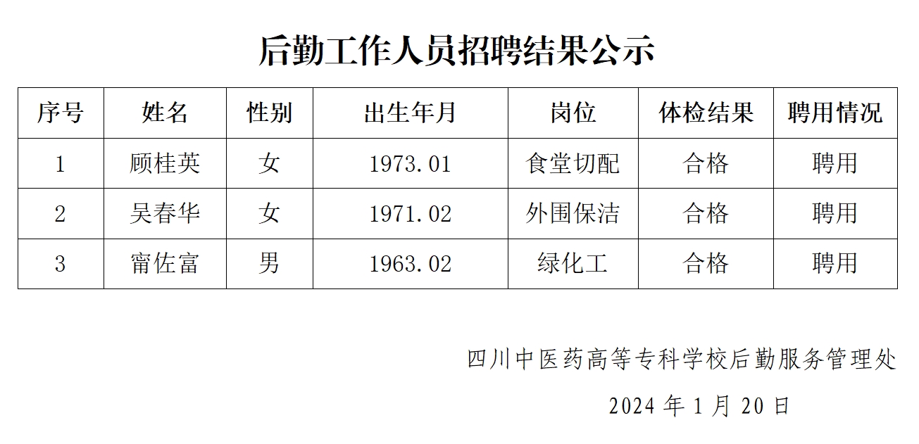 后勤工作人员招聘结果公示