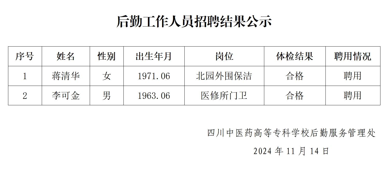 后勤工作人员招聘结果公示