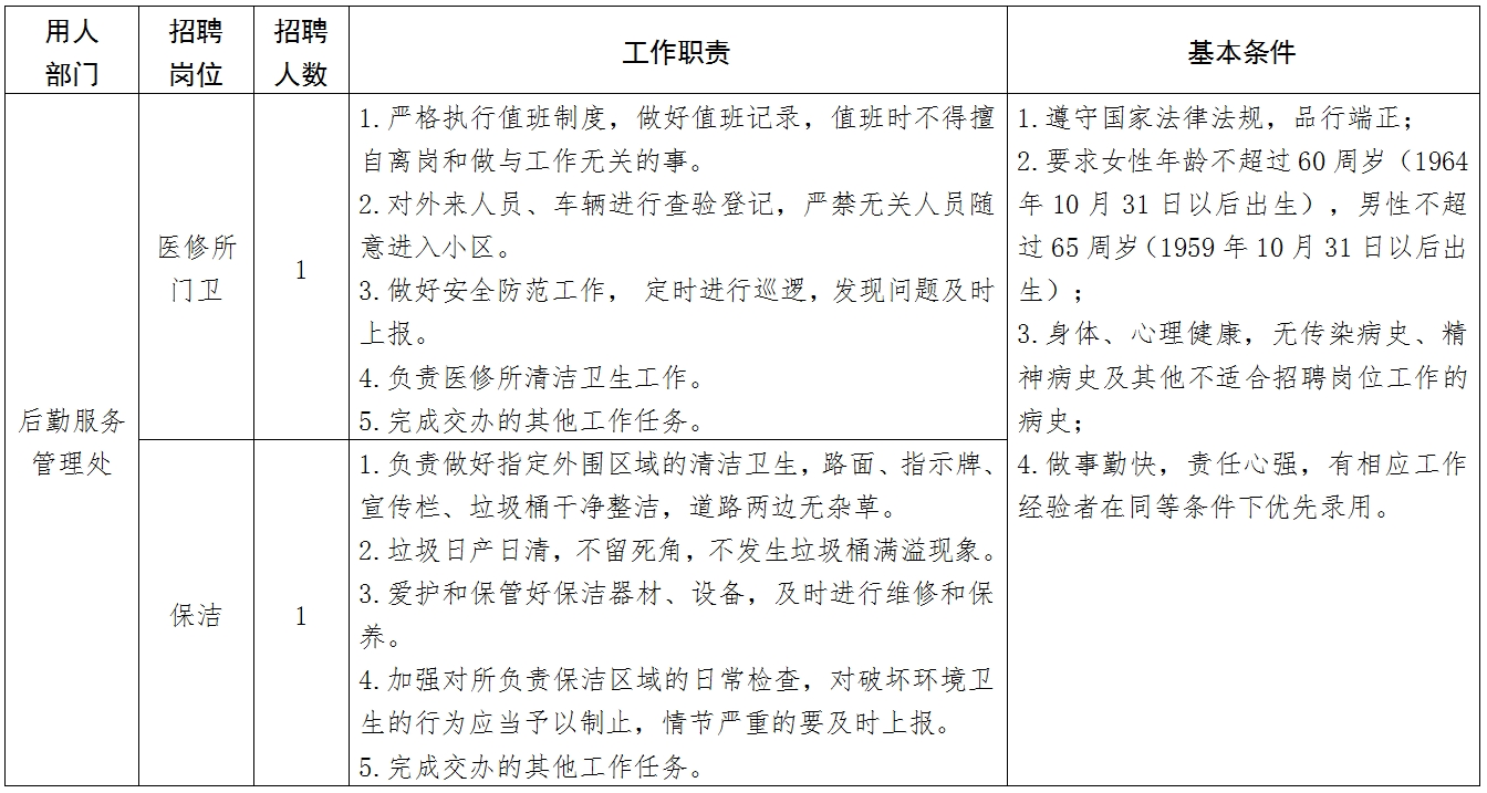 4.薪酬待遇:购买五险,医修所门卫2800元/月,保洁2000元/月(含社会保险个人部分)。