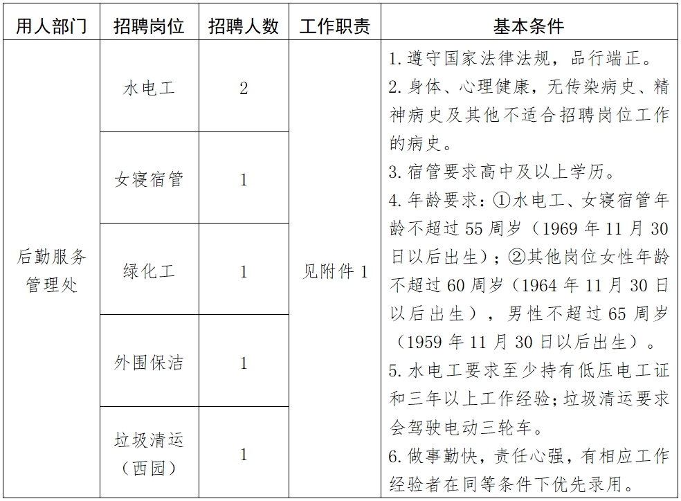 4.薪酬待遇:购买五险,水电工2500-4000元/月(根据实际职责确定),女寝宿管2100元/月,绿化工2400元/月,外围保洁2000元/月,垃圾清运2000元/月(含社会保险个人部分)。