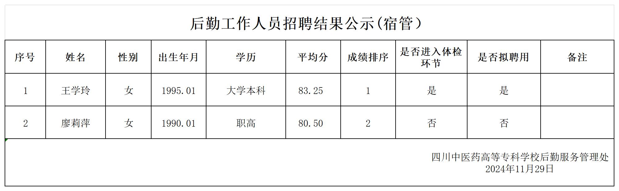 后勤工作人员招聘结果公示(宿管)