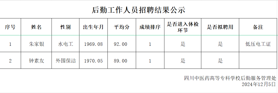 后勤工作人员招聘结果公示(水电工、外围保洁)