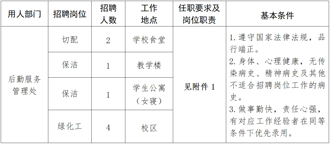 5.薪酬待遇:购买五险,食堂切配3000-3500元/月(根据实际职责确定),教学楼保洁2200元/月,学生公寓保洁2200元/月,绿化工2400元/月(上述工资含社会保险个人部分)。