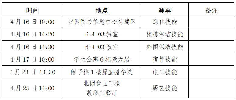 1.本次比赛项目由各中心结合岗位特点自行设计,分为绿化技能、楼栋保洁技能、外围保洁技能、宿管技能、厨艺技能、电工技能六个专业技能赛事。