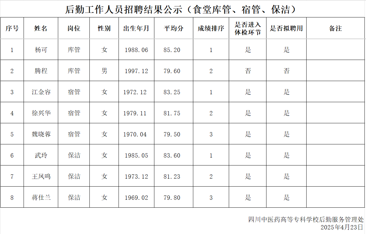 后勤工作人员招聘结果公示(食堂库管、宿管、保洁)