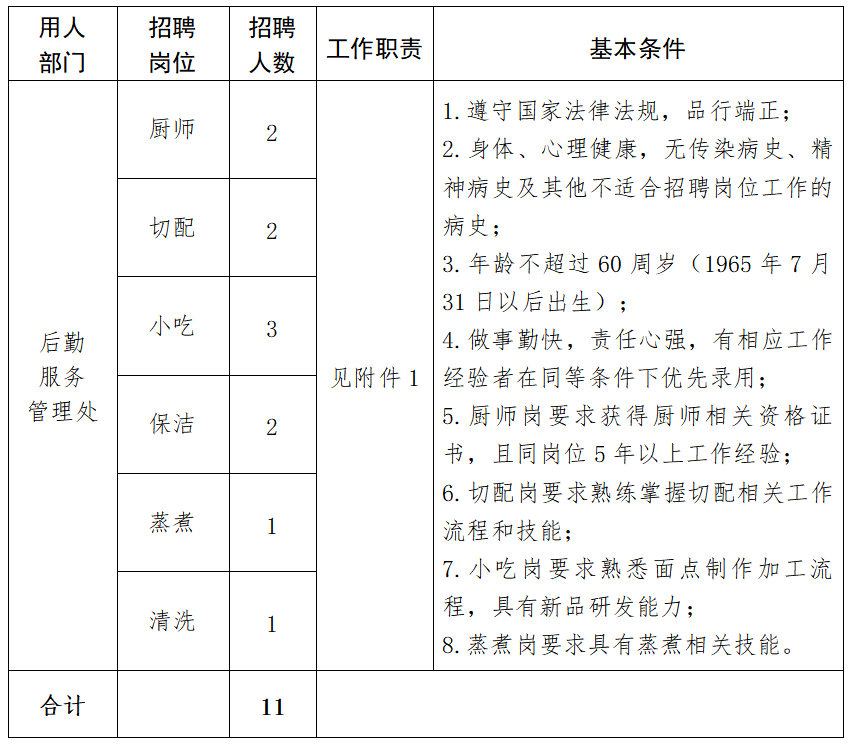 因工作需要,现面向社会公开招聘食堂工作人员数名。有关事项公告如下: