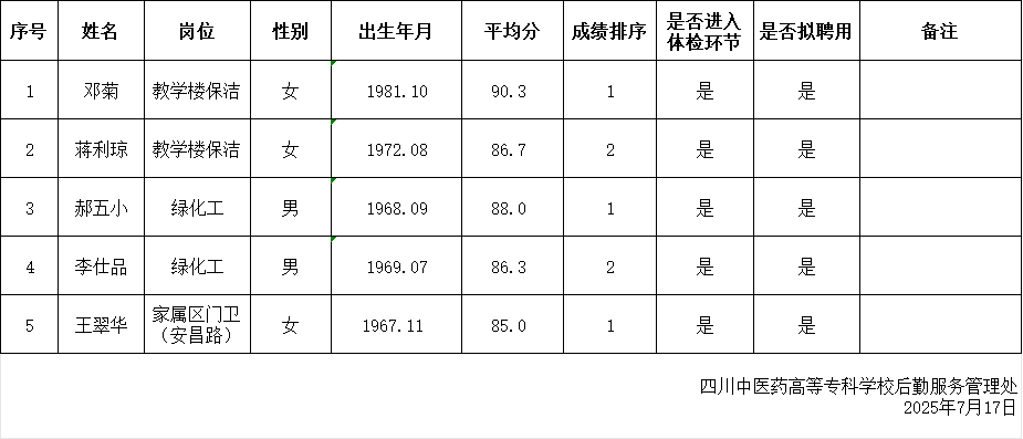 后勤工作人员招聘结果公示(教学楼保洁、绿化工、西园家属区门卫)