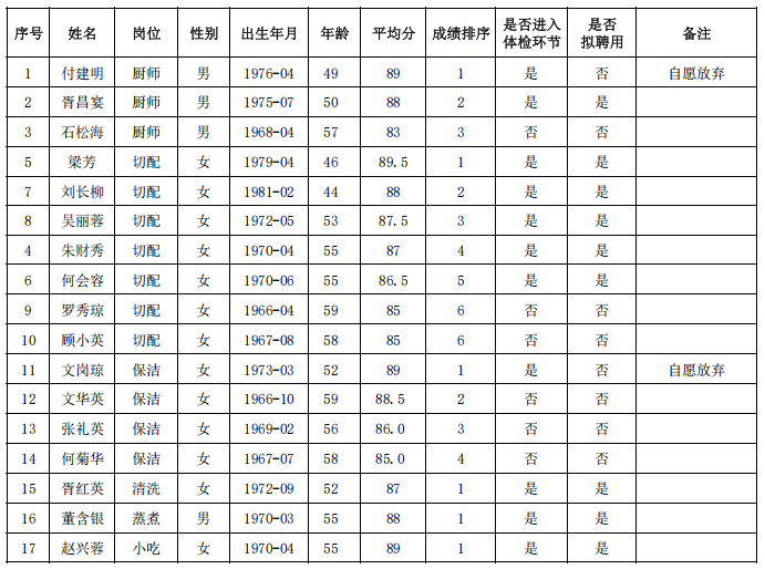 食堂工作人员招聘结果公示(厨师、切配、…