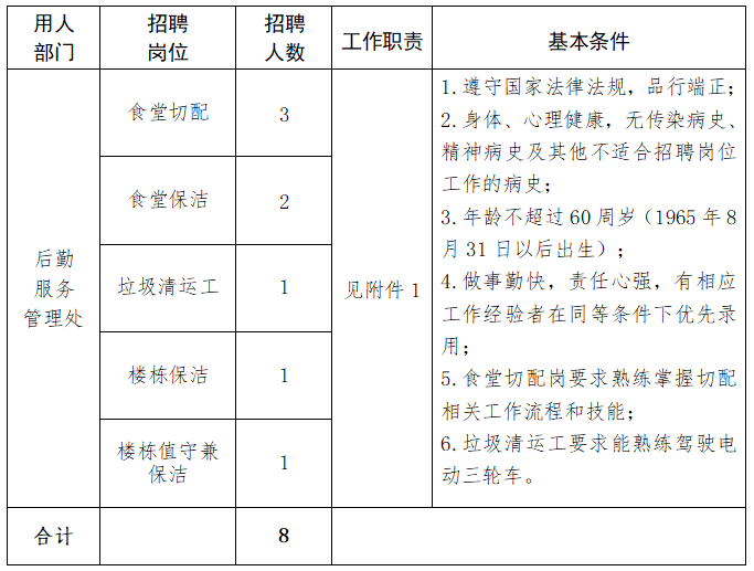 4.薪酬待遇:食堂切配3000元/月,食堂保洁2500元/月,垃圾清运工2600元/月,楼栋保洁2200元/月,楼栋值守兼保洁2200元/月(上述工资包含五险一金个人缴费部分)。