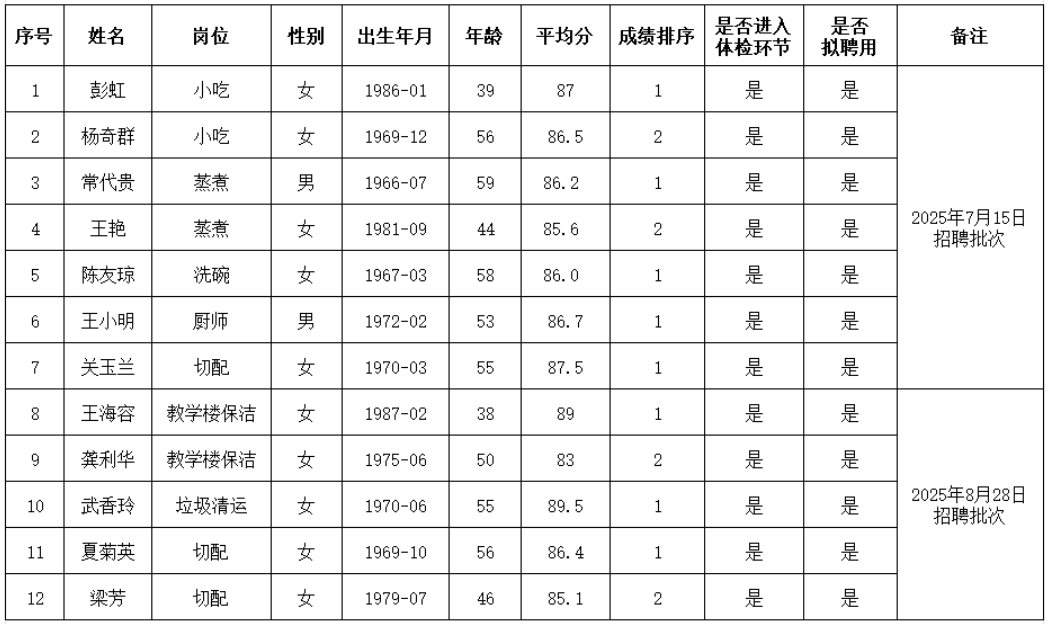后勤工作人员招聘结果公示(小吃、蒸煮、洗碗、厨师、切配、教学楼保洁、垃圾清运、切配)