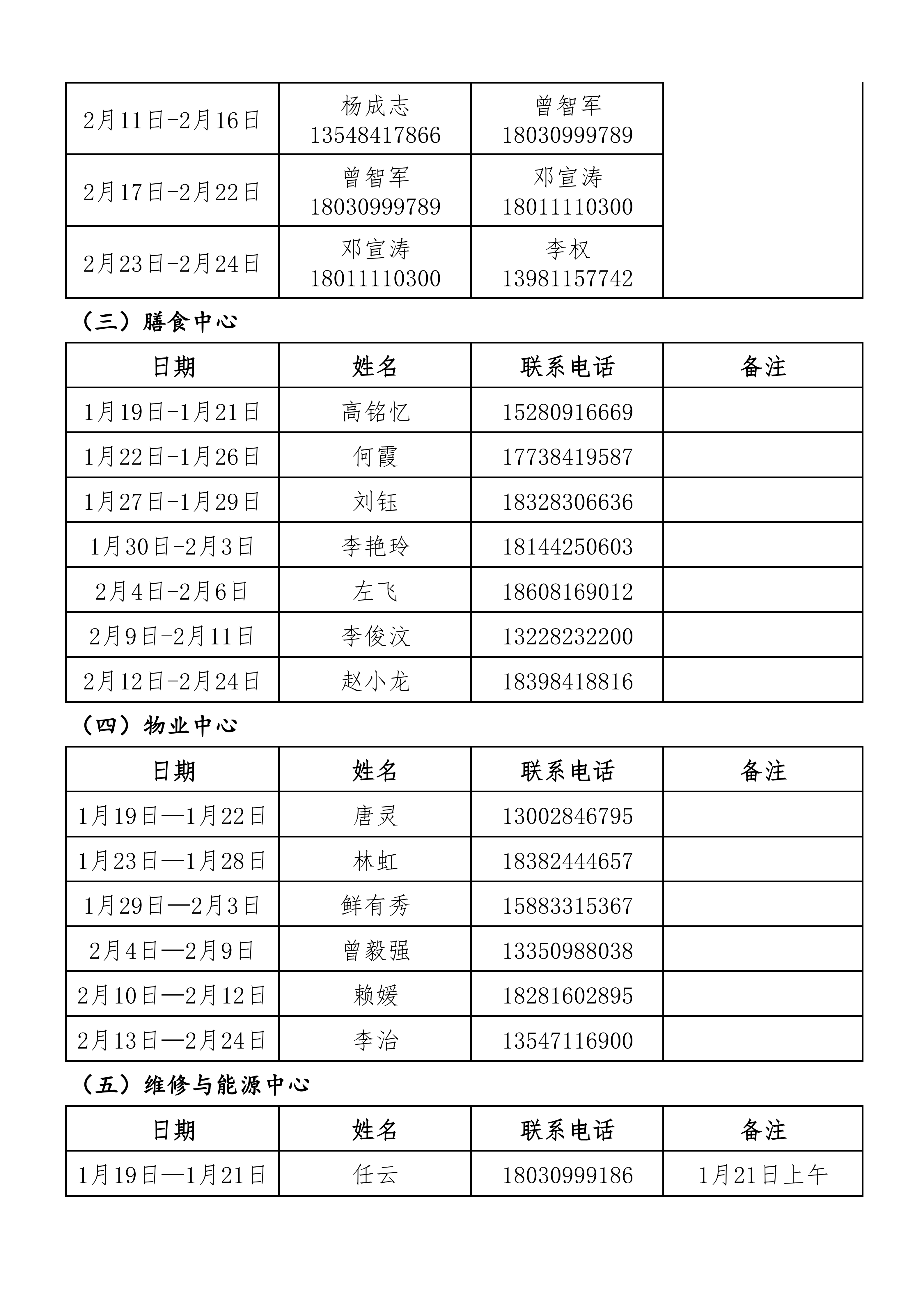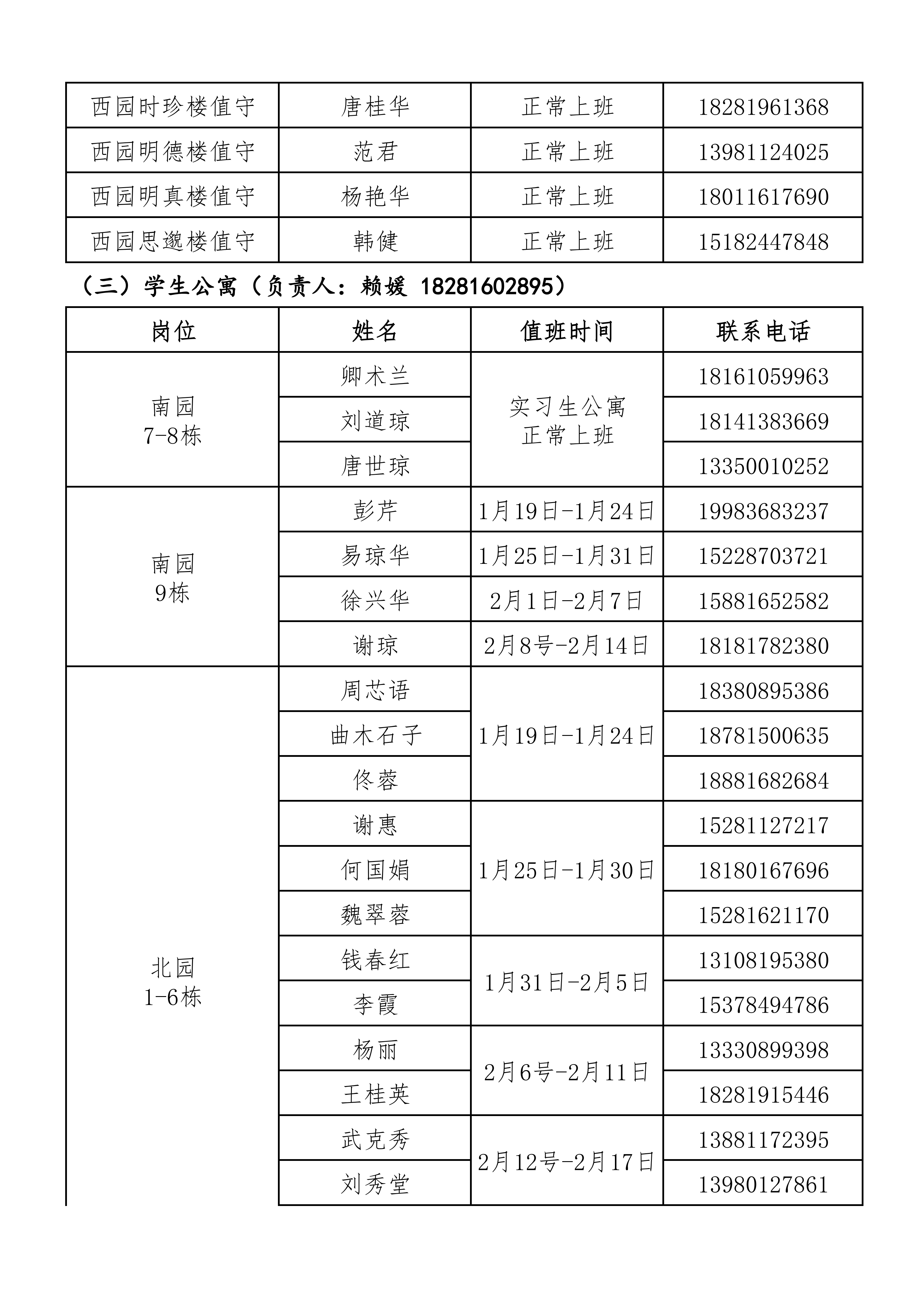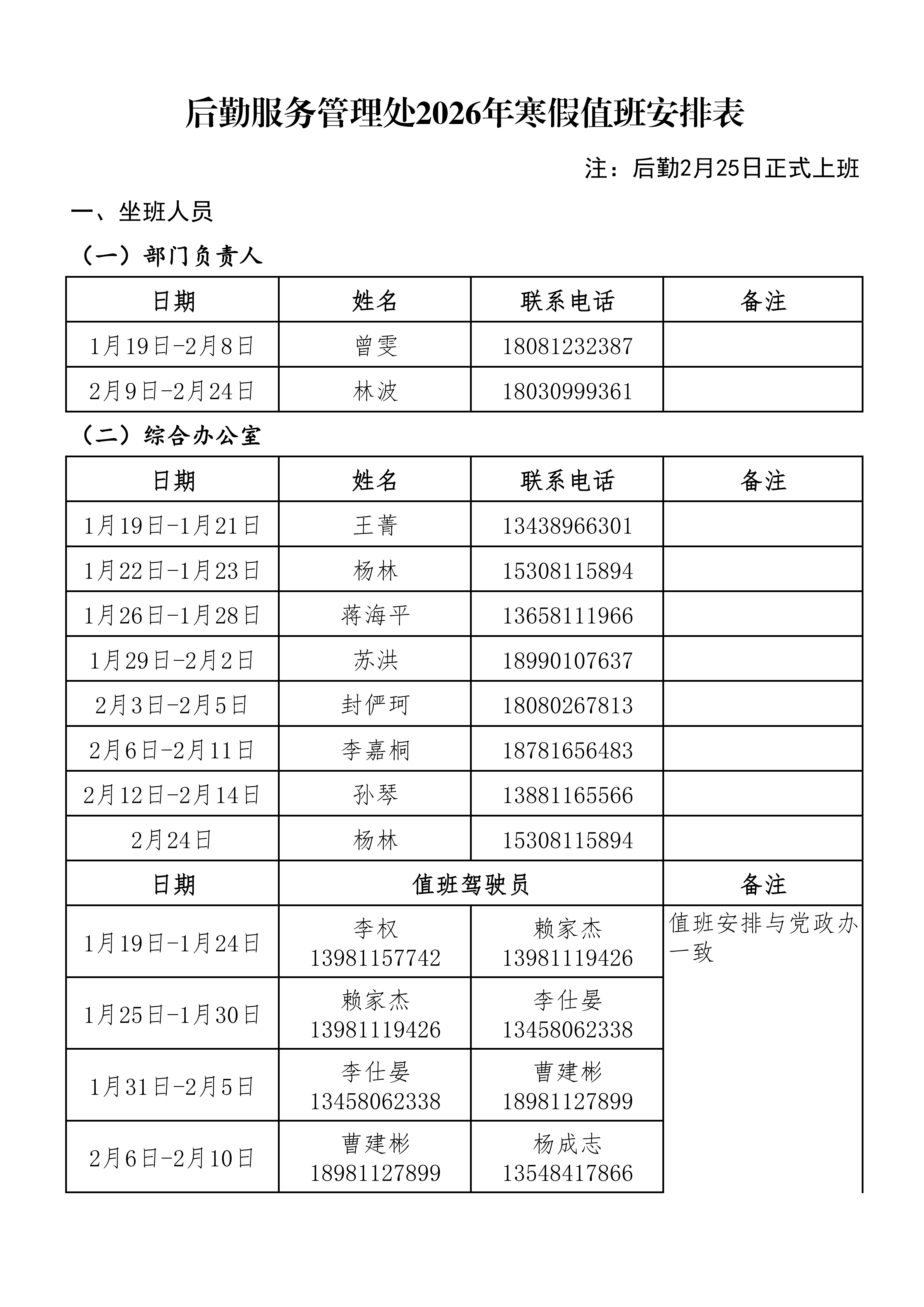 后勤服务管理处2026年寒假值班安排表
