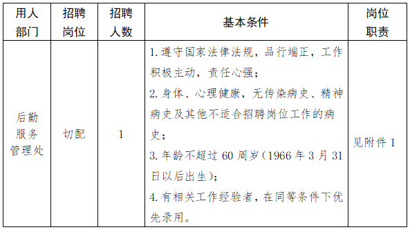 因工作需要,现面向社会公开招聘食堂切配1名。有关事项公告如下: