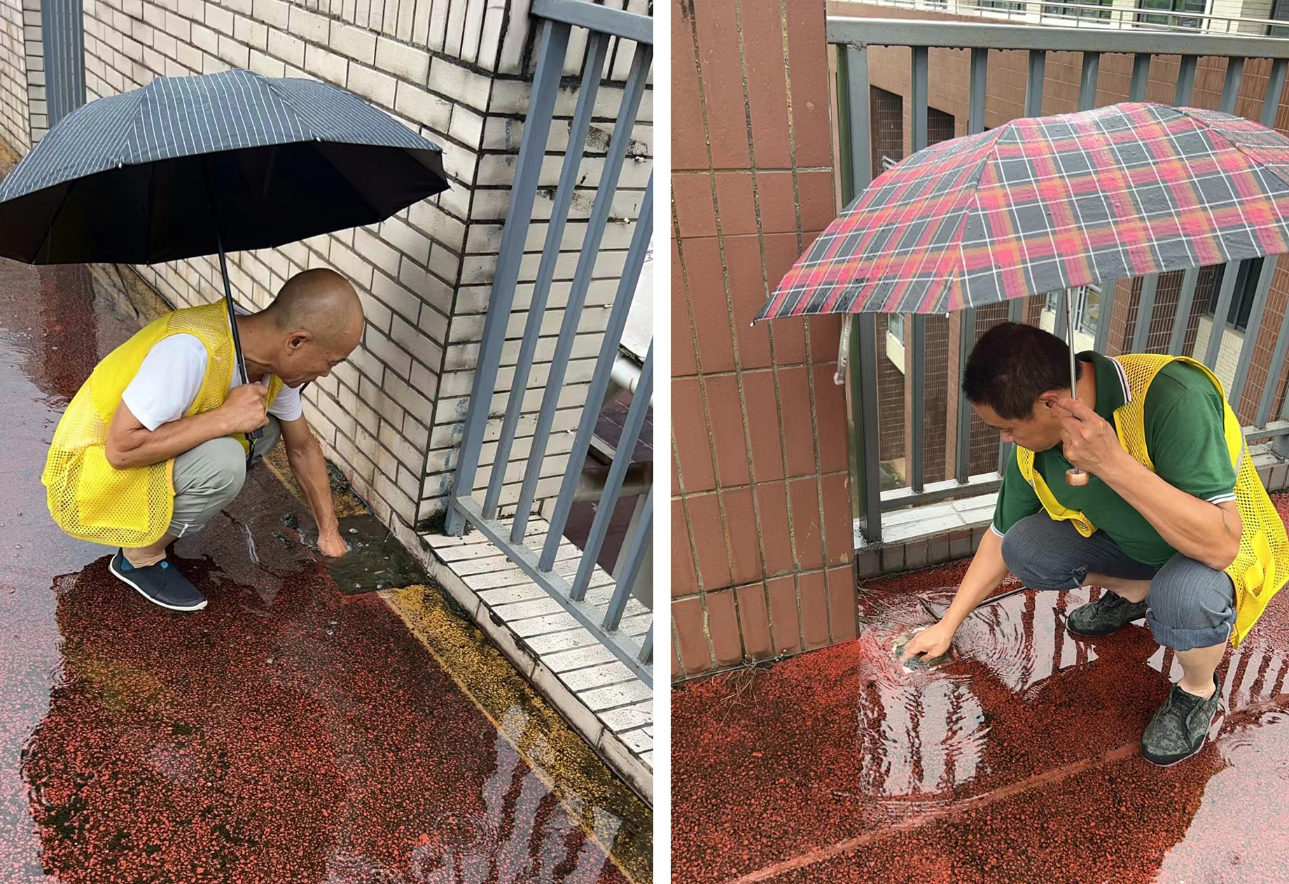 工作人员检查楼顶和廊桥排水情况