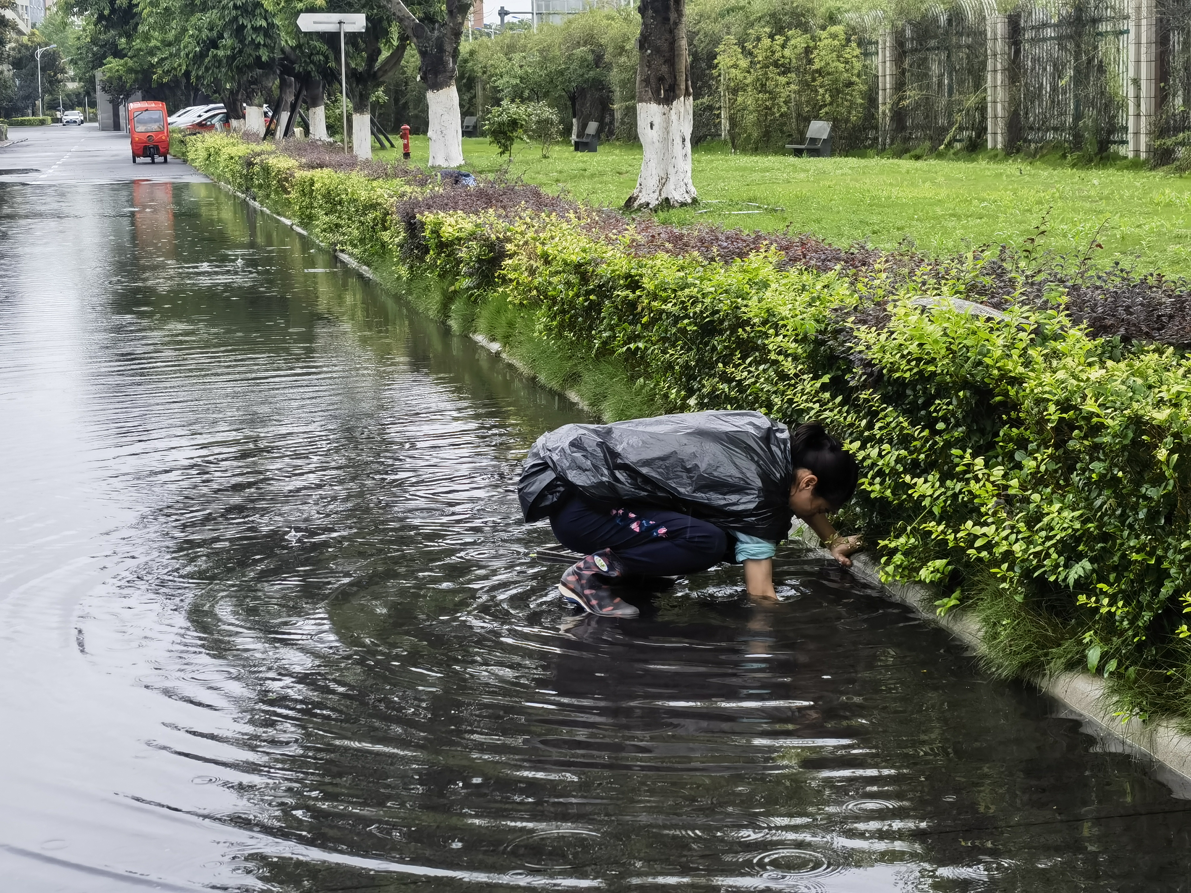 工作人员用手疏通排水沟