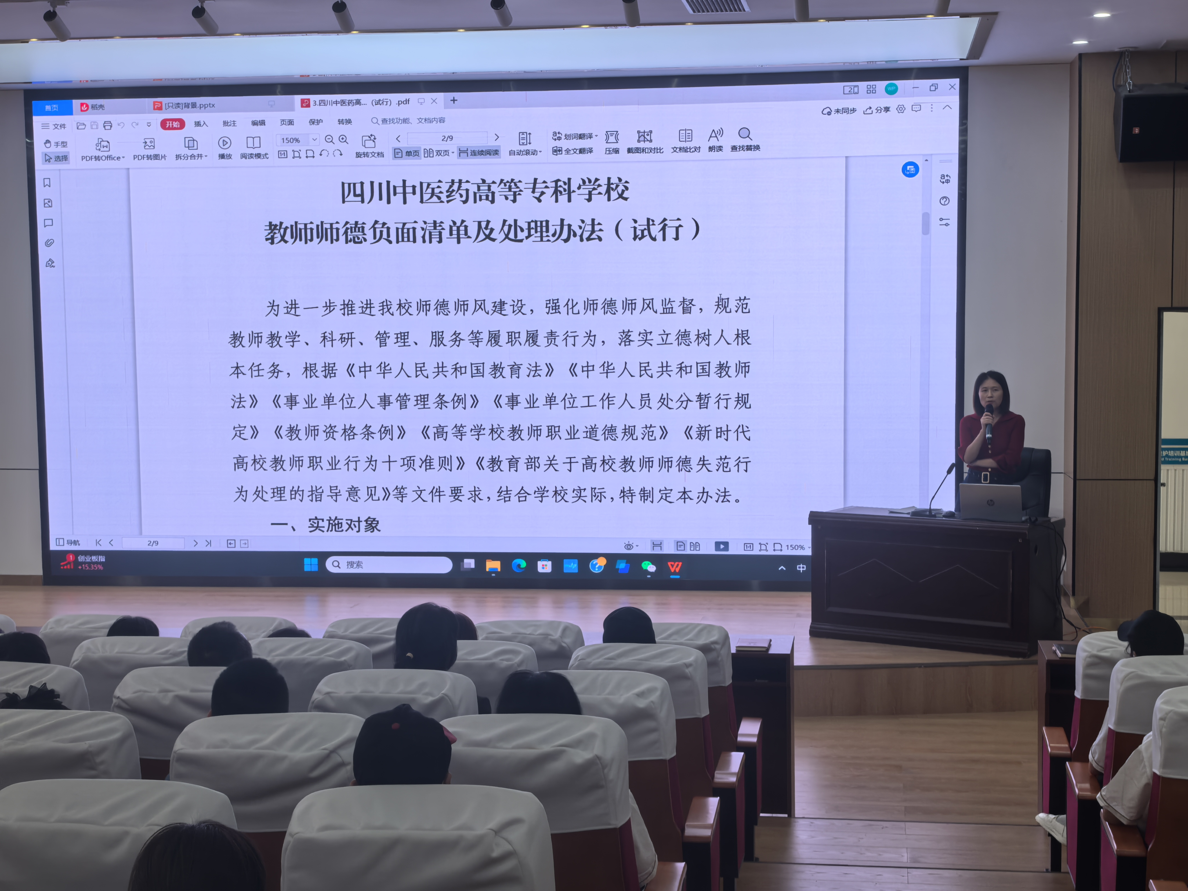 会上组织学习了《四川中医药高等专科学校教师师德负面清单及处理办法(试行)》《四川省学校食堂有害生物防治工作指引》《四川省学校食堂复用餐饮具清洗消毒保洁指引》等文件,结合师德负面清单、食品加工卫生规范、燃气安全操作规程和日常维保要求、突发事件应急处置等内容展开细致分析和讲解。