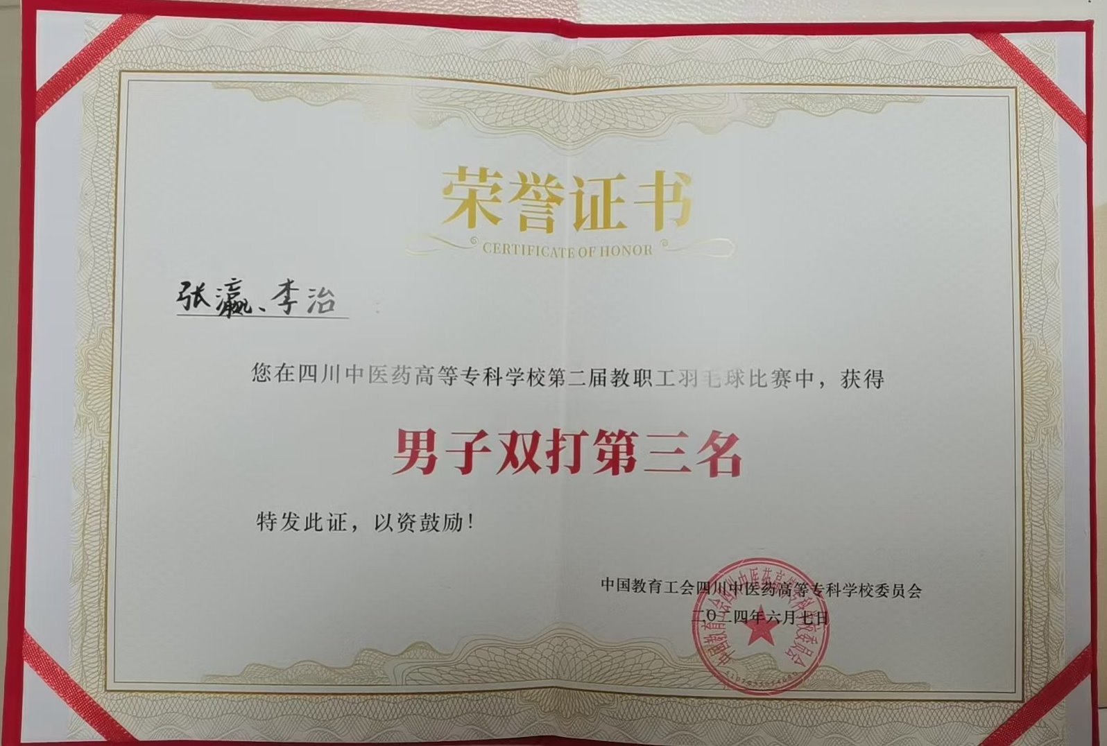 后勤分工会张瀛、李治同志获得第二届教职工羽毛球比赛男子双打第三名