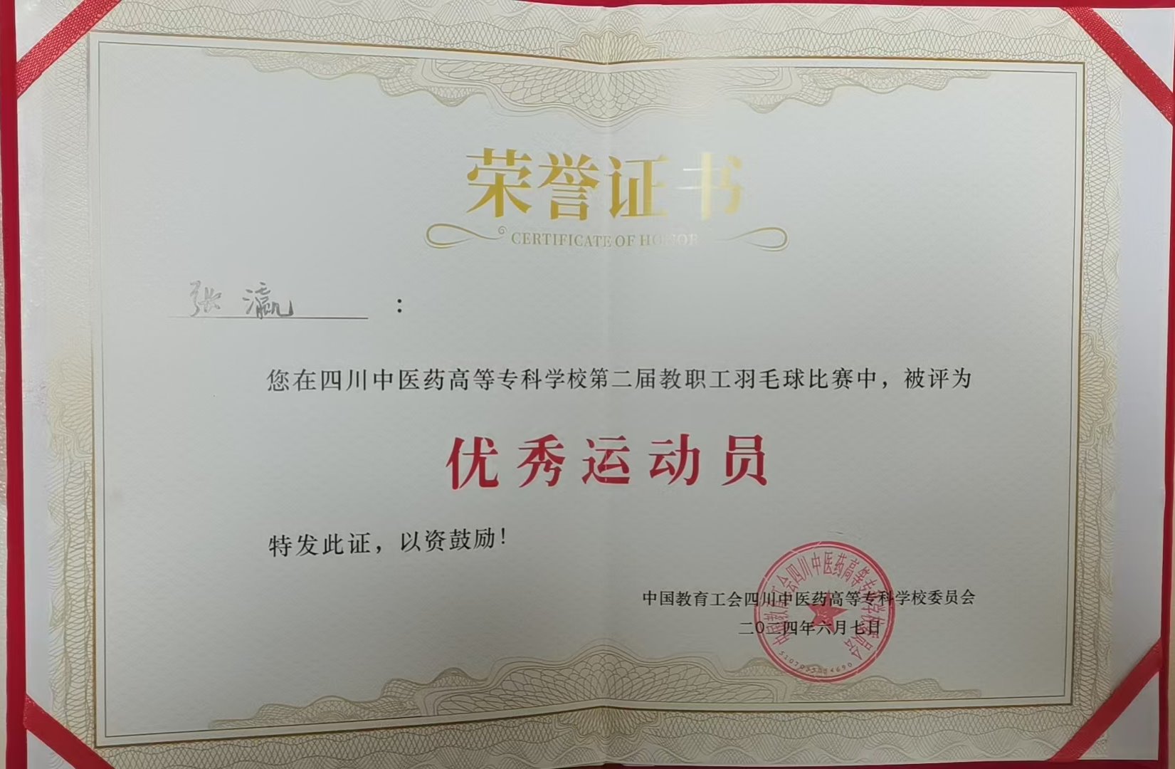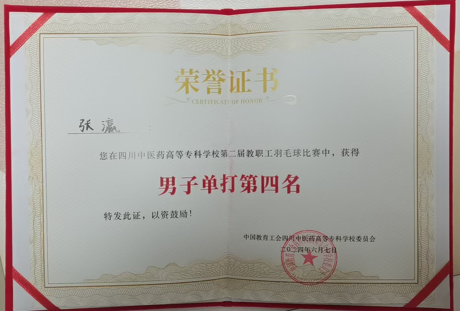 后勤分工会张瀛同志获得第二届教职工羽毛球比赛男子单打第四名和优秀运动员称号
