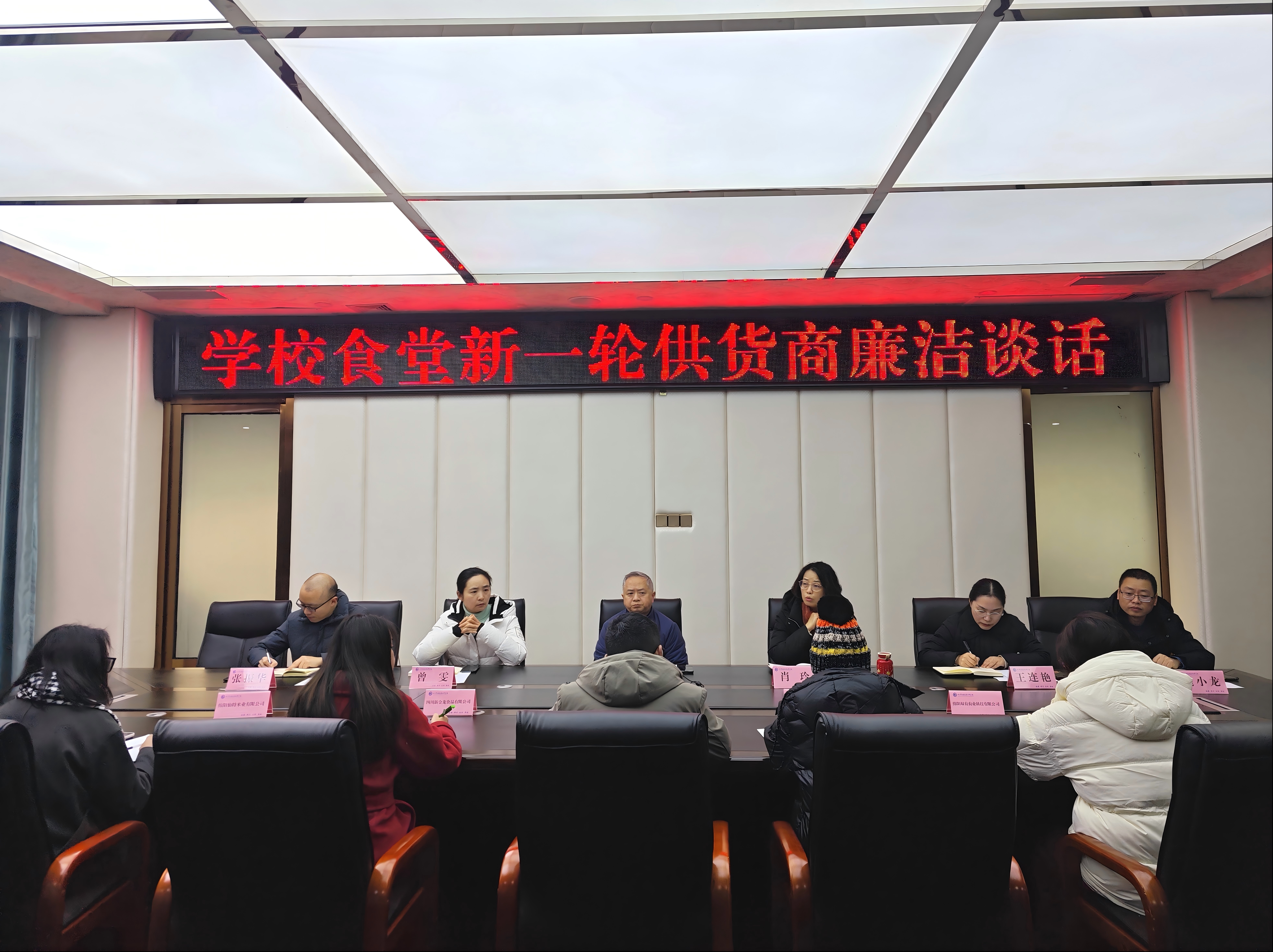 1月3日,我校开展食堂新一轮大宗食材供货商廉洁谈话,纪委书记李文虎、副校长肖玲以及相关部门人员和六家食材供货商负责人参加会议。