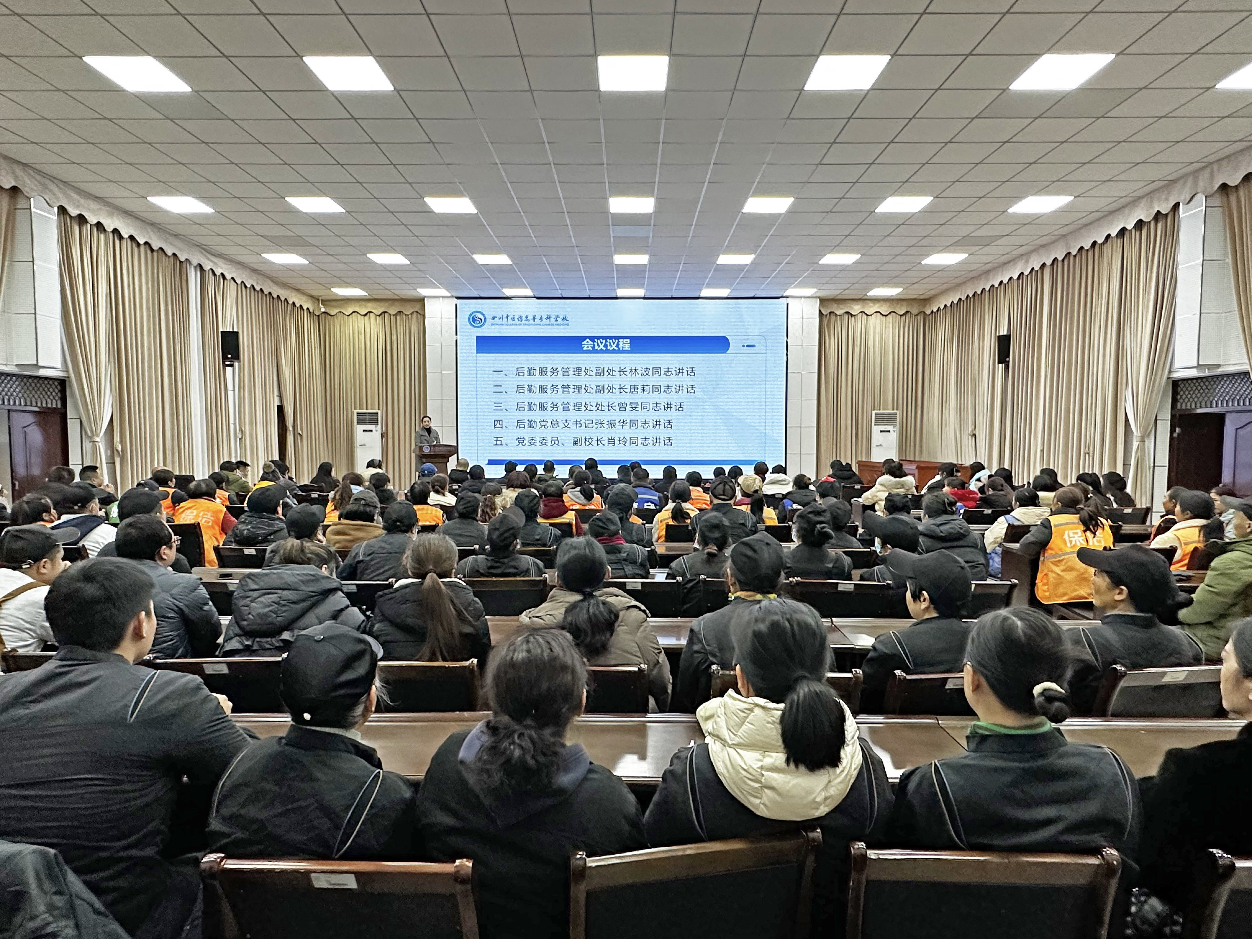 2月14日上午,后勤服务管理处在综合楼5楼会议室召开新学期职工大会。党委委员、副校长肖玲和后勤党总支书记张振华出席会议。