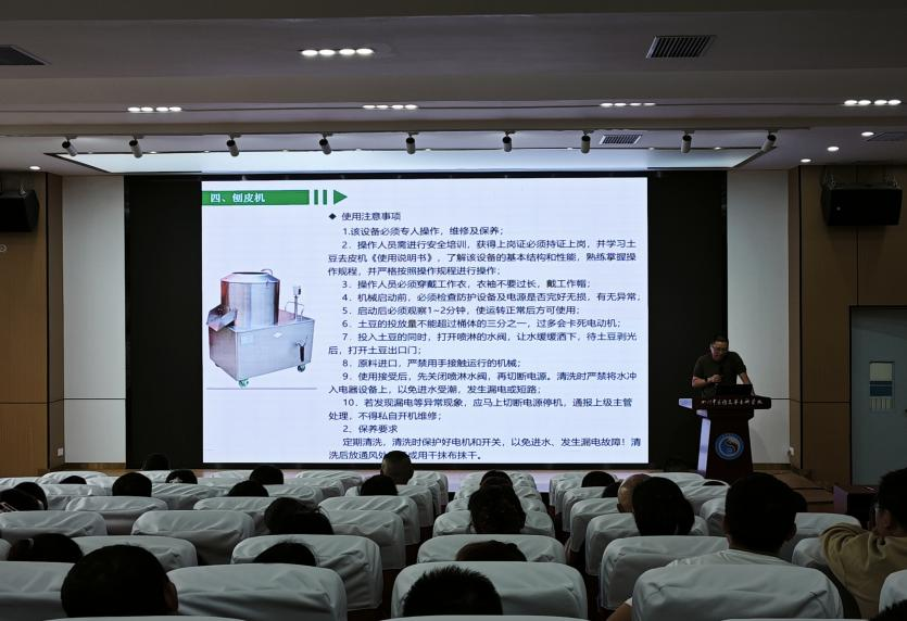 10月15日,膳食中心在北园学术厅开展食堂设备专项培训。中心负责人赵小龙详细讲解了14类设备操作规程,明确“专人专管、作业前检查、运转中禁触、断电后清理”等核心要求。曾雯处长强调“持证上岗、按规操作、日常点检”三严格原则,以零事故为目标,全面筑牢食品安全和作业安全防线。