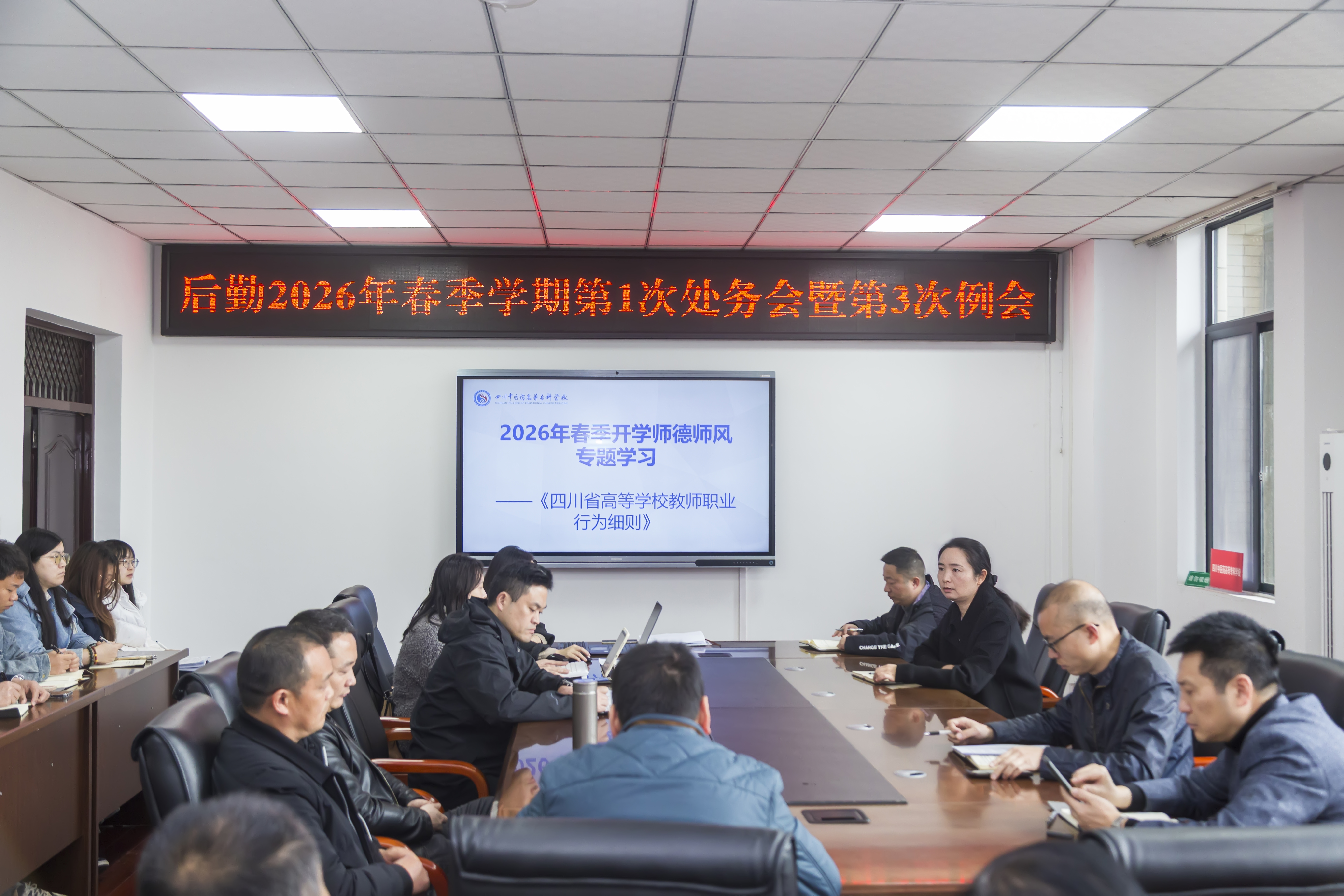 会议集体学习了《四川省高等学校教师职业行为细则》《后勤服务综合应急预案》等内容。各中心通报了寒假工作完成情况及开学工作计划,部门负责同志就新学期重点工作作出具体安排。