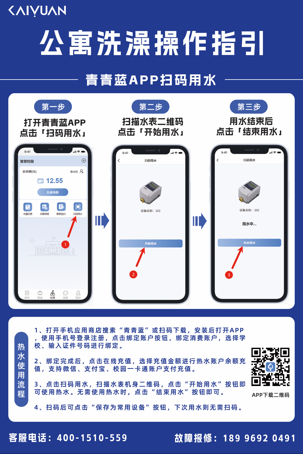 为方便同学们顺畅使用“青青蓝”APP充值/扫码用水功能,以下为注意事项,帮助大家快速上手: